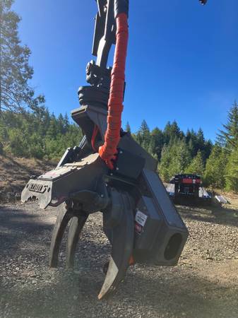 Has pin grabber plate for fast change from bucket to felling head.